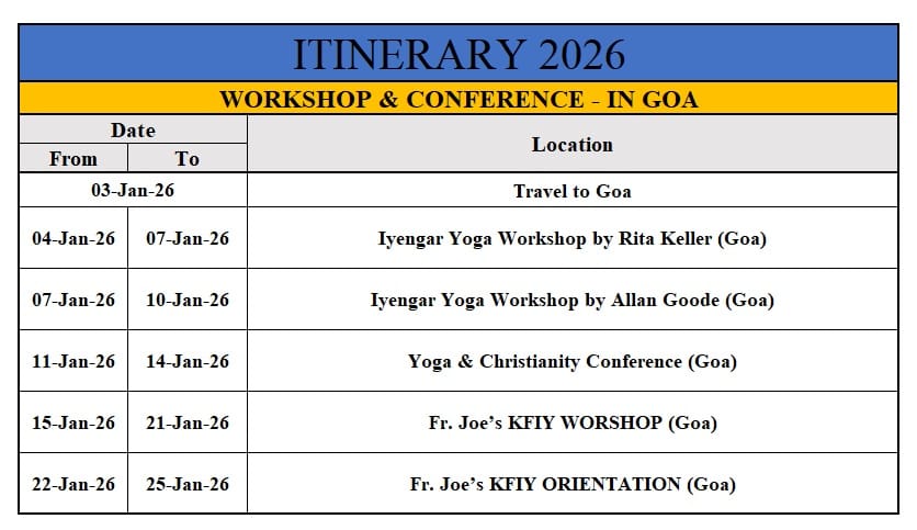 Between 1987 till 2015, various international workshops have been conducted by Fr Joe at Portland, Oregon and Hot Springs, California in USA and at Calgary and Toronto, Canada on Yoga. “Innovative Methods of Healing the Addict” and “Effectiveness of Yoga in Substance Abusers” within the Kripa Model with the help of “Kripafoundation Iyengar Yoga™”, were research activities presented at the Dharam Hinduja Institute of Indic Research at the Faculty of Divinity in University of Cambridge, UK.